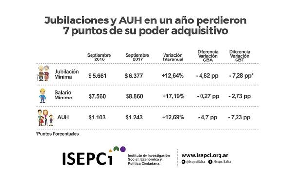Antes de que se efectivicen los aumentos, los especialistas observaron mes a mes el comportamiento de los precios y sacaron conclusiones, sobre la pérdida del poder de compra. “Si comparamos los salarios que efectivamente percibían el mes de septiembre de 2016 los receptores de las remuneraciones mínimas con la suba de los precios, se ve claramente que en los últimos 12 meses jubilados y beneficiarios de la AUH tuvieron pérdidas del poder adquisitivo no menor de siete puntos”, afirmaron.