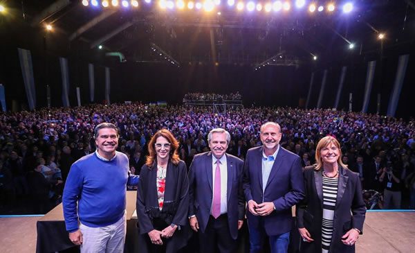El gentío festejó al escuchar el grito de un militante: “¡Sacaste a pasear al Gato, Alberto!”, cuando Fernández se sentaba en el escenario con María Eugenia Bielsa, y los electos Perotti y Alejandra Rodenas, y el flamante gobernador electo de Chaco.